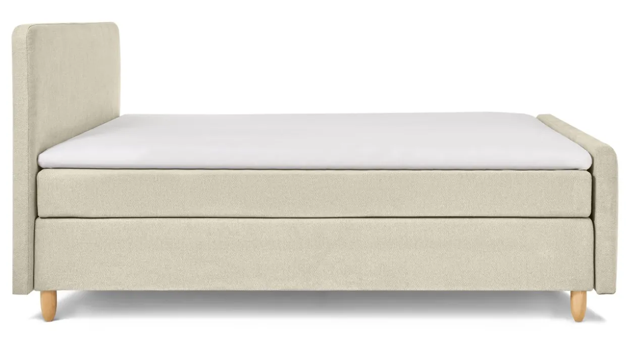 Boxspring Round vlak met gestoffeerd matras en voetbord is verkrijgbaar in meerdere maten en is geschikt voor een gewicht tot 120 kg.