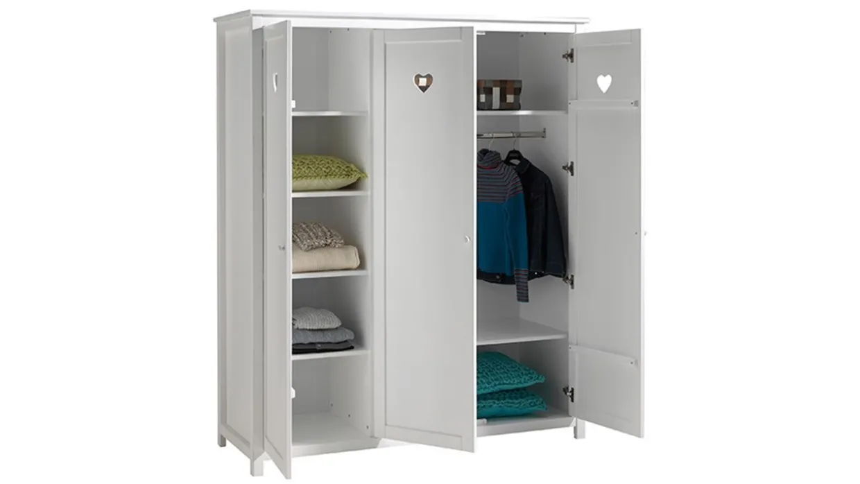 Zeker als je ook een bed van de Amori serie in de kinderkamer hebt staan, dan mag Draaideurkast Amori 3-deurs écht niet ontbreken. Iedere kinderkamer moet natuurlijk een kledingkast hebben. Maar deze kast heeft precies dezelfde aandoenlijke stijl als de rest van de Amori serie. Hebben dus! De kast heeft een grote roede en twee legplanken in het ene kastdeel en vier legplanken in het andere kastdeel. Deze schattige looks met subtiel verwerkte hartjes zijn terug te vinden in de hele Vipack Amori serie.