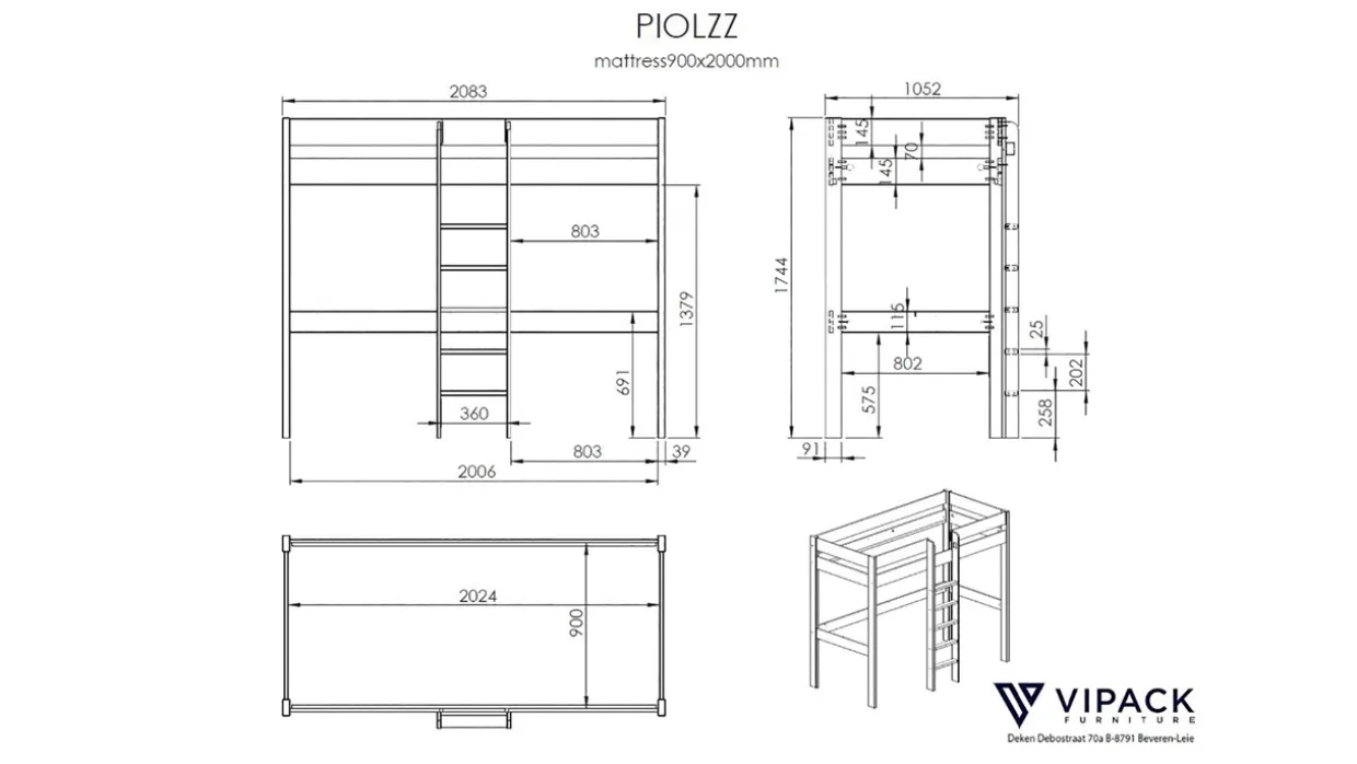 Hoogslaper Pino hoog wordt geleverd met bedbodem, zonder matras.