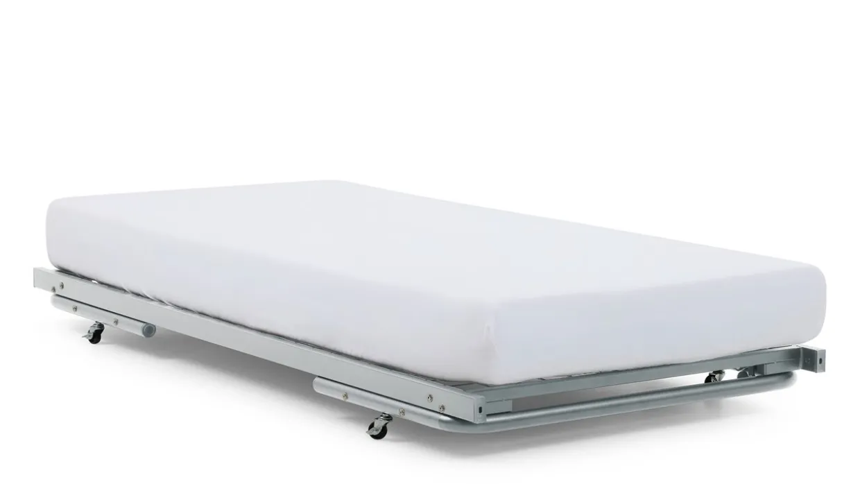Heb jij het bijbehorende (boven)bed Doppia ook gezien? Dit zeer compacte eenpersoonsbed neemt weinig ruimte in beslag en heeft precies genoeg ruimte om dit onderschuifbed onder te schuiven. Zo heb je altijd twee 1-persoonsbedden of een 2-persoonsbed voor logés bij de hand. Je kunt het onderschuifbed namelijk op dezelfde hoogte als het bovenbed trekken.