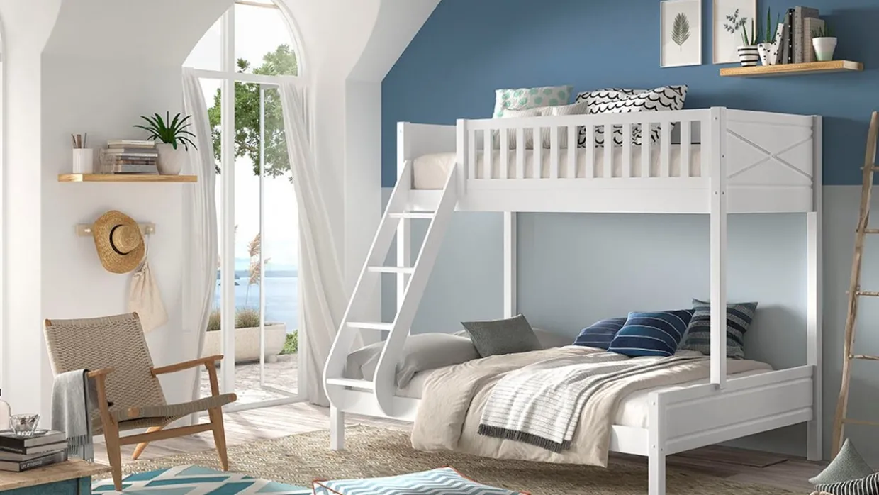 Een fris briesje, de golvende zee, een bakkende zon én Stapelbed Scott 3-persoons met ladenset. Hét ultieme strandgevoel in de beach house kinderkamer. Het kalme, wit geschilderde grenenhout neemt je mee naar het strand. Zo heb je het hele jaar door een zomerse vibe in de kinderkamer. En dat terwijl je kinderen gezellig samen kunnen slapen. Het bed wordt ook geleverd met Ladenset Pino/Scott.