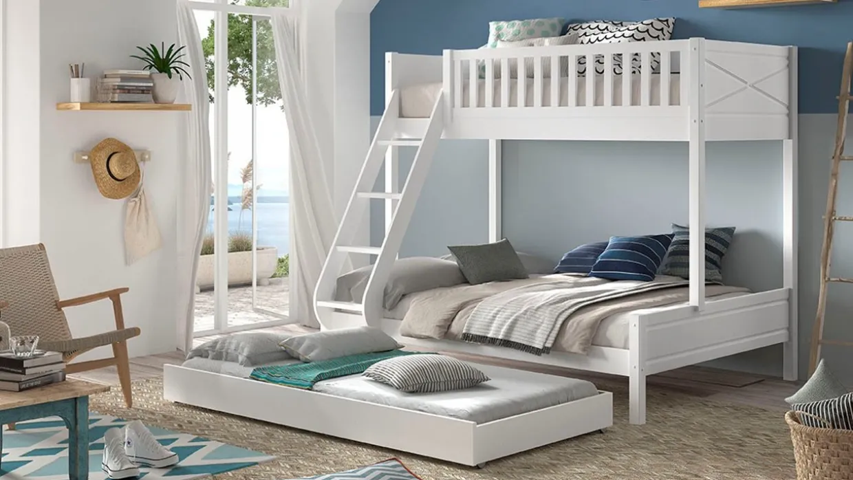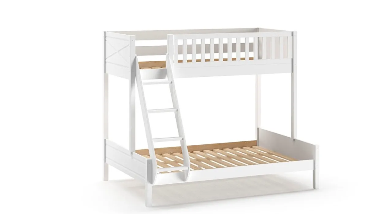 Stapelbed Scott 3-persoons wordt geleverd met bedbodems, zonder matrassen.
