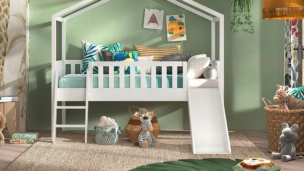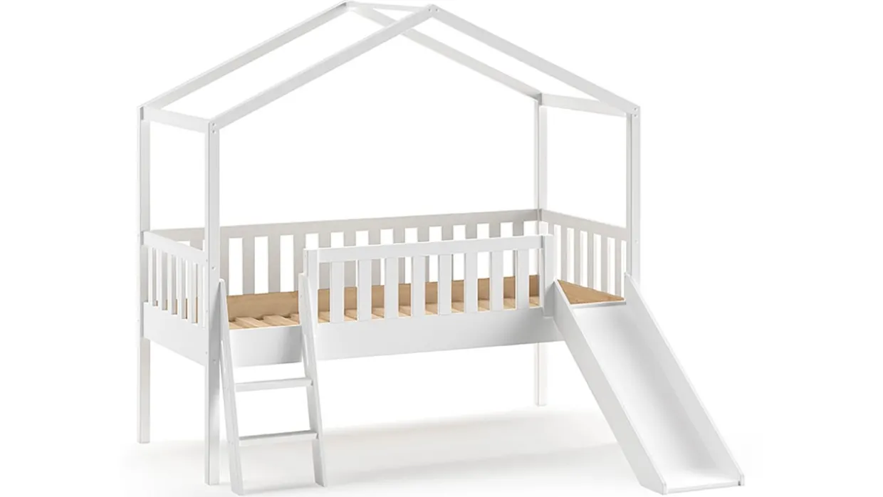 Halfhoogslaper Dallas als huis met glijbaan wordt geleverd met bedbodem en dakframe, zonder matras.
