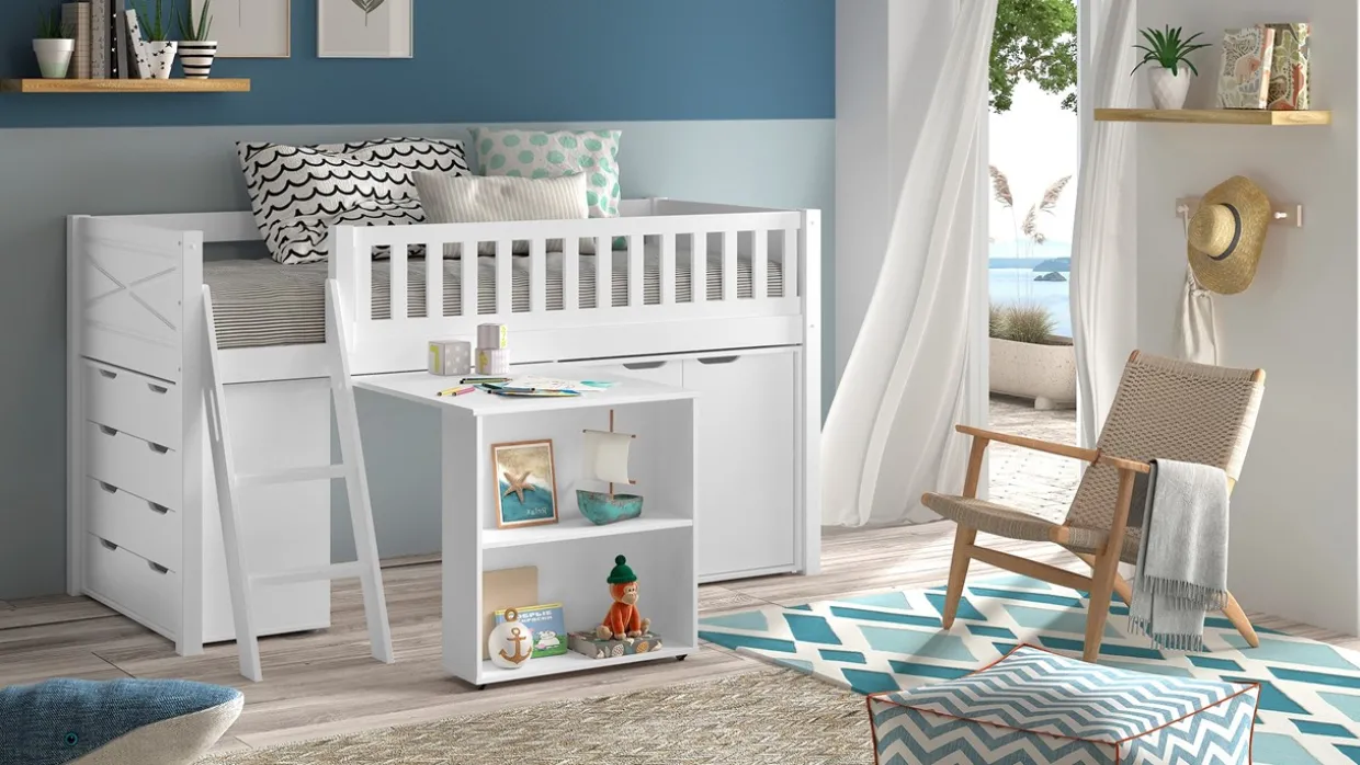 Een fris briesje, de golvende zee, een bakkende zon én Halfhoogslaper Scott met bureau en 2 commodes. Hét ultieme strandgevoel in de beach house kinderkamer. Zo heb je het hele jaar door een zomerse vibe in de kinderkamer. De halfhoogslaper wordt geleverd met Bureau voor halfhoogslaper Pino/Scott, Commode 2 deuren Pino/Scott en Commode 4 laden Pino/Scott.