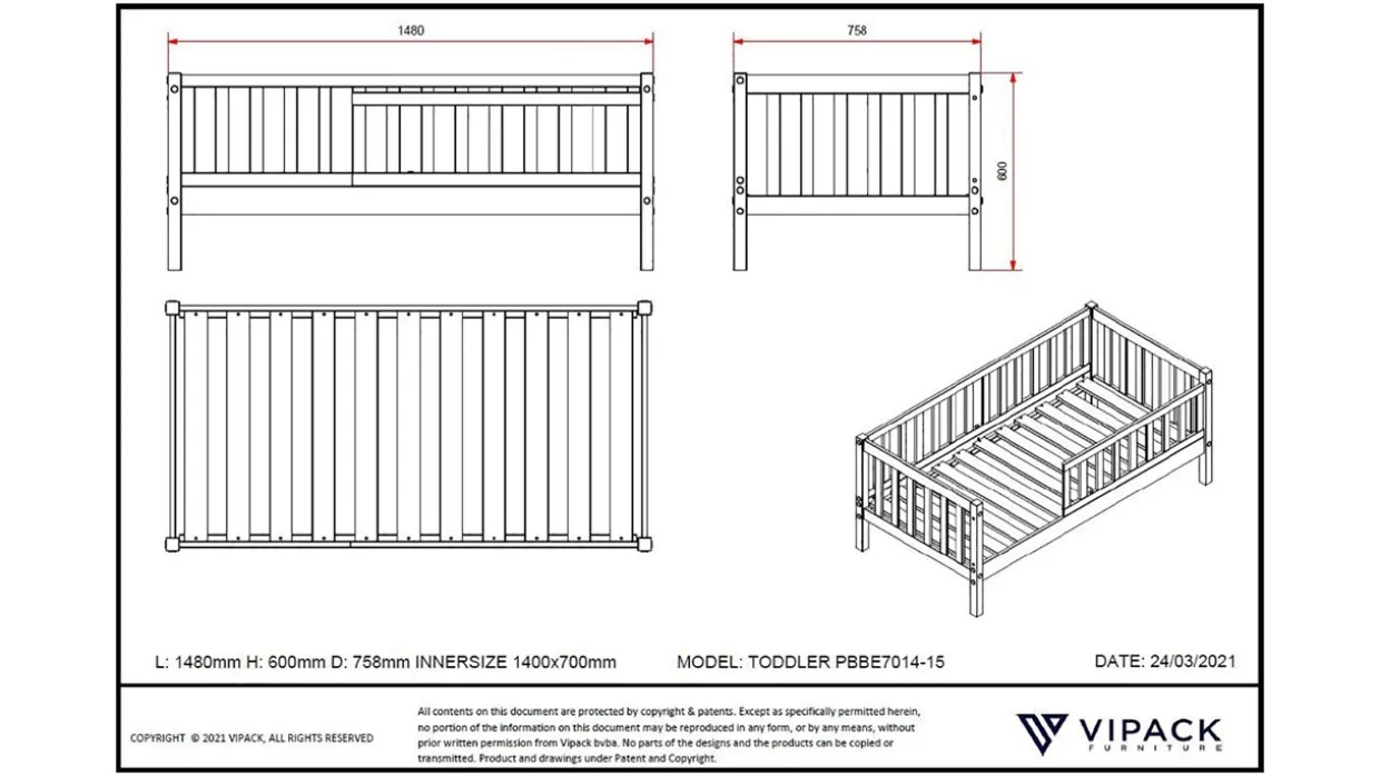 Babyledikant Baby Bed 70 wordt geleverd met bedbodem, zonder matras.