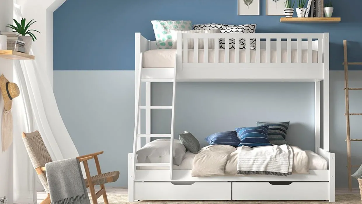 Stapelbed Scott 3-persoons wordt geleverd met bedbodems, zonder matrassen.